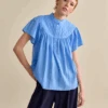 Second Female Bristol Fiesta Blouse, a coral and cream stripy top with short puffed sleeves and a round smocked neckline. Fastening at the back with a small button this striped top has a stretchy elasticated waistband and a peplum hem.