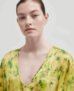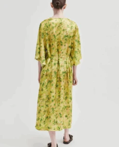 Second Female Crocus Reseda Dress, a colourful belted tunic dress. Made in soft viscose satin with all-over print the Reseda has a v-neckline and wide flared sleeves. Thin tie belt with belt loops at the waist and deep slits to each side. With a fluid fit.