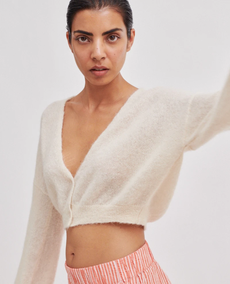 Second Female Perla Ivory Cream Knit Cardigan, a lightweight and finely-knitted yarn blend cardigan with a deep V-neckline. Two-button fastening with delicate mother-of-pearl buttons finish the piece, with dropped shoulders and puffed sleeves.