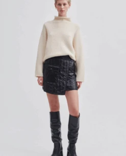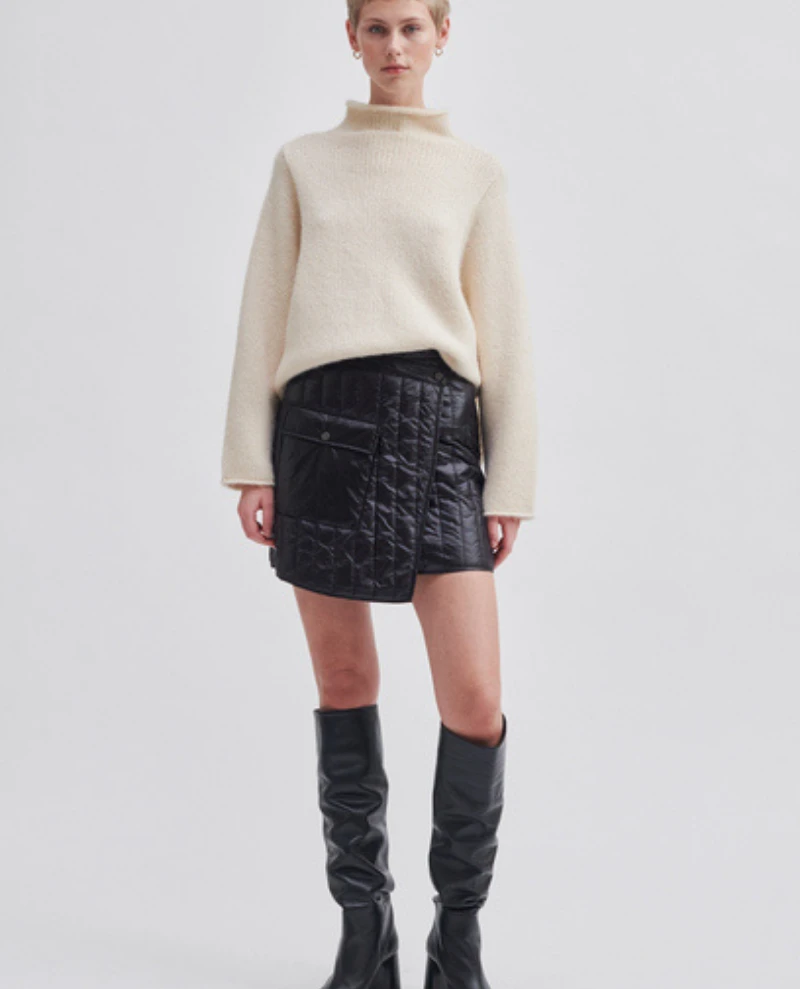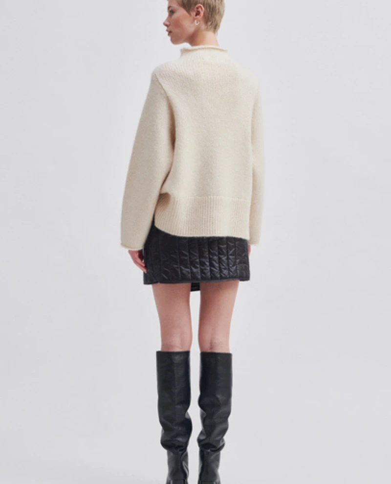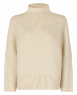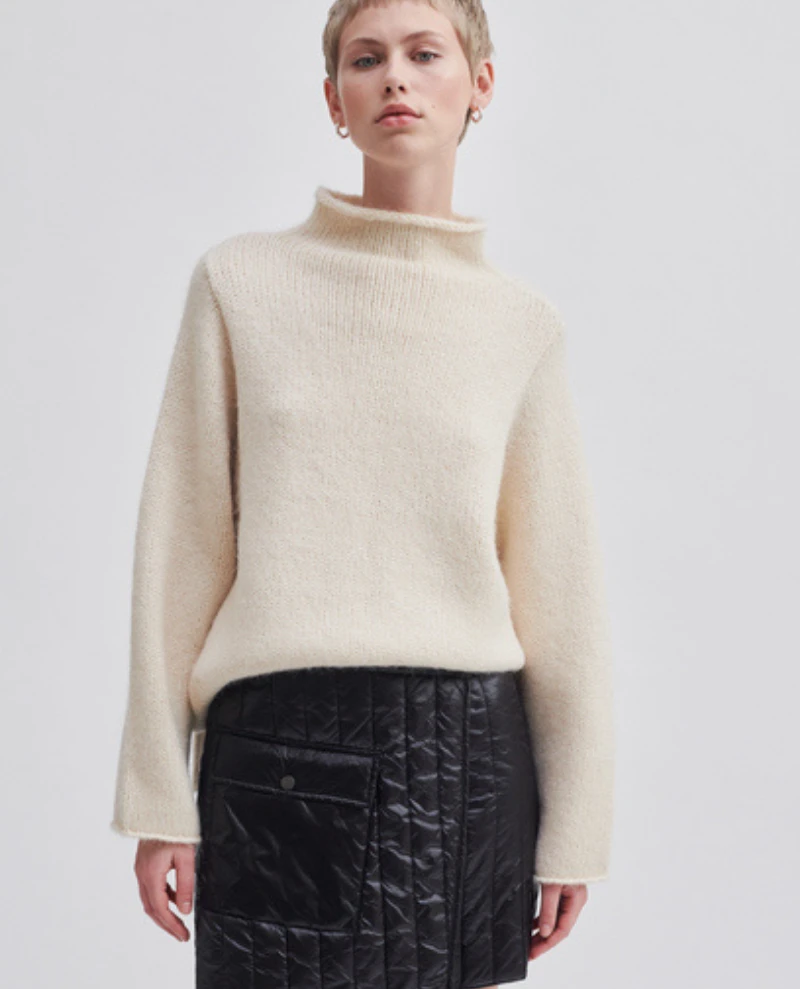Introducing Second Female’s Rikke Chalk Knit. Crafted with a fine knit and warm cream tone, this style features a funnel neckline and long sleeves for an elegant silhouette. Perfect for sophisticated styling, this timeless piece adds a neutral touch to any outfit.