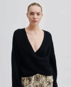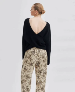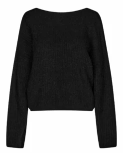 The Second Female Ymma Black Knit is ideal for adding a modern touch to any wardrobe. Its versatile design can be worn both ways, with a rounded neckline and a stylish cross-back detail. This lightweight yet warm knit also features long sleeves for added elegance. Perfect for any occasion.