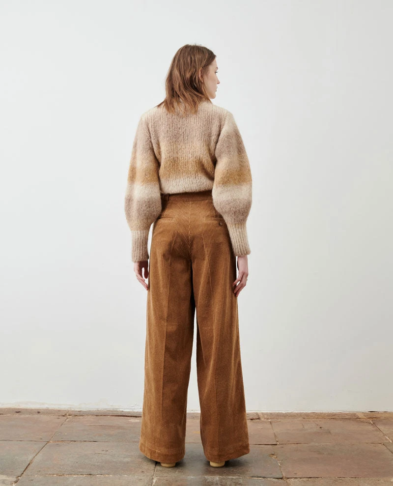 Sessun Andree Malt Trousers, a neutral beige cord style trouser. With high rise and a flared fit, the Andree is a flattering trouser complete with classic zip closure and belt loops.