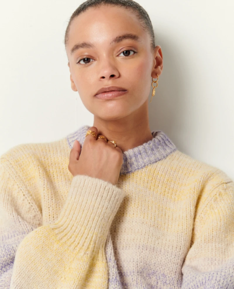 Sessun Girolamo Sunset Yellow Knit, a beautiful chunky knit with crewneck. The Girolamo knit has long, voluminous sleeves and is finished in pastel yellow and violet tones.