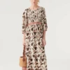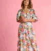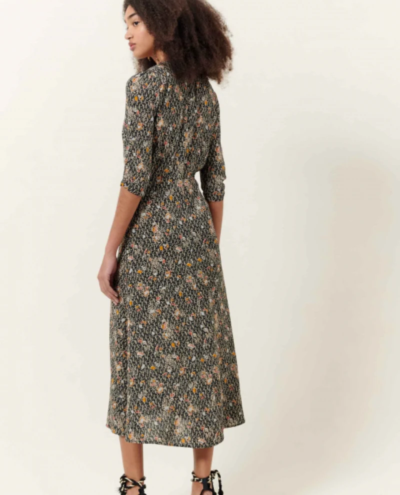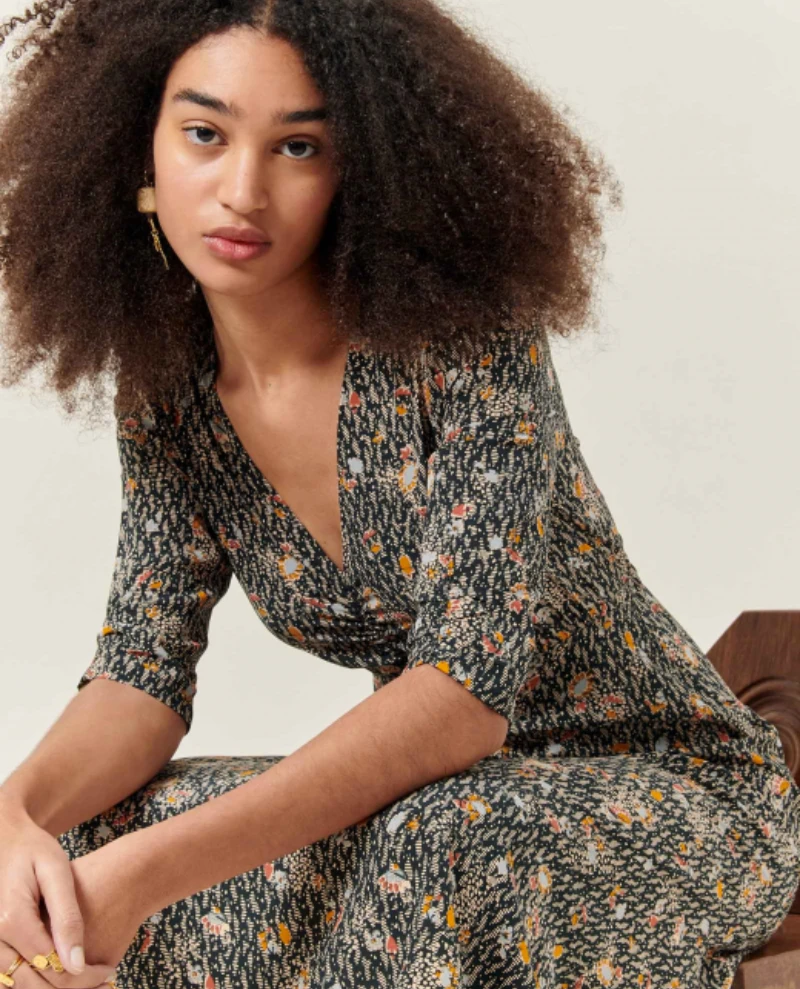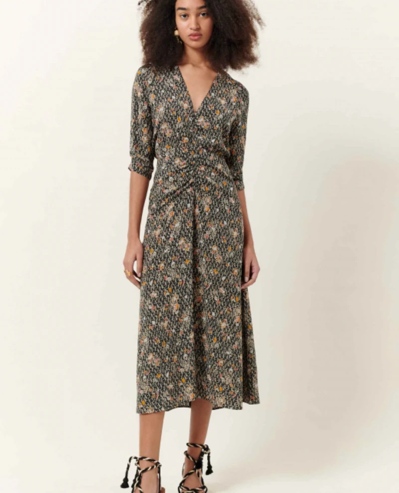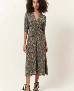 Sessun Nylia Bloom Tempo Dress, a micro pattern dress with a flattering silhouette. With a midi length and elegant, v-neckline, the Nylia Bloom dress has gathers to the central front, creating lovely shaping to the dress and a flattering finish.