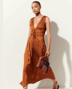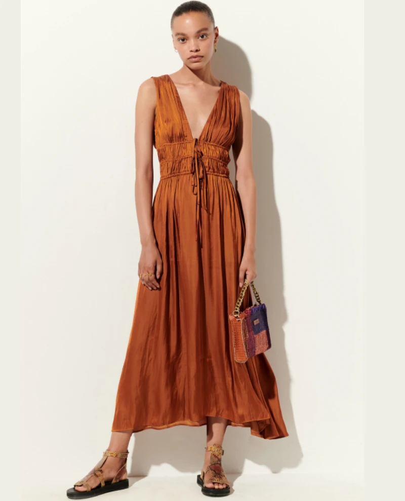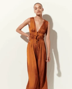 Sessun Preziosa Dress, a stunning amber toned dress with slight sheen. The Preziosa dress is sleeveless, with deep v-neck and tie details at the waist for a flattering silhouette. Complete with long, floaty skirt this dress has a gorgeous drape on the frame.