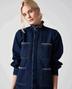 This Seventy and Mochi Pablo Dark Vintage Jacket is an expertly crafted piece of fashion with an excellent combination of features. From the signature blanket stitching on the patch pockets to the frill collar, this jacket will be sure to turn heads in any setting. It also has a loose fitting and relaxed body and soft balloon shaping sleeves, creating a unique look. Plus, it’s made with certified organic cotton, recycled cotton, and eco-made elastane, making it an excellent eco-friendly choice.