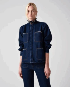 This Seventy and Mochi Pablo Dark Vintage Jacket is an expertly crafted piece of fashion with an excellent combination of features. From the signature blanket stitching on the patch pockets to the frill collar, this jacket will be sure to turn heads in any setting. It also has a loose fitting and relaxed body and soft balloon shaping sleeves, creating a unique look. Plus, it’s made with certified organic cotton, recycled cotton, and eco-made elastane, making it an excellent eco-friendly choice.