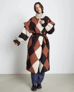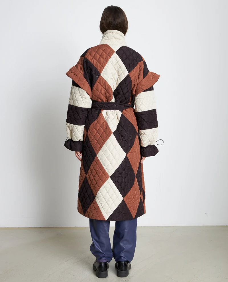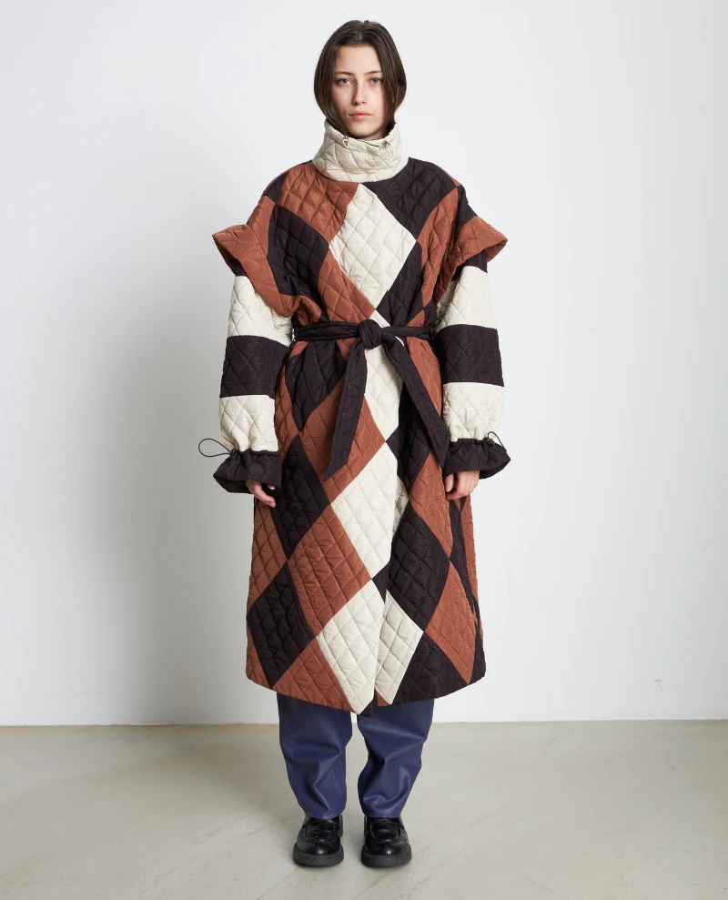 Stay warm and stylish in Stella Nova’s Mathine Quilted Coat. This oversized quilted jacket features an earthy tone of brown, black and cream. With a funnel neck and tie belt to waist, it’s designed to provide you with extra protection on those chilly winter days. Drawstring detail to the cuffs provides an adjustable fit.