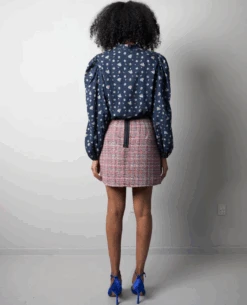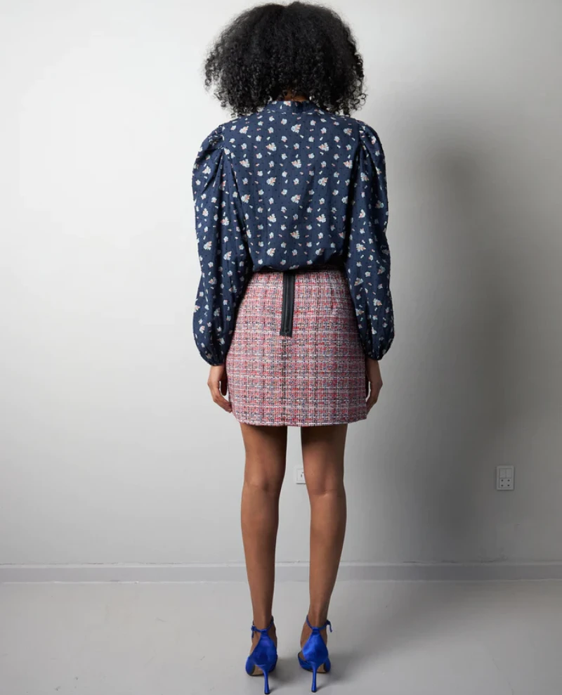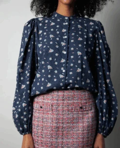 Stella Nova Niella Dark Floral Blouse, a classic button down shirt in dark navy with small floral pattern detail. With voluminous sleeves and a rounded neckline.