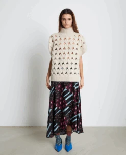 The Stella Nova Odile Cream Sweater Vest is an easy way to bring warmth and style to any outfit. Crafted from lightweight fabric with rib detail to hem and a loose crochet style weave, this cream vest features a funnel neck and short sleeves for a stylish, contemporary silhouette. Layer over a crisp white shirt for an extra touch of comfort and warmth.