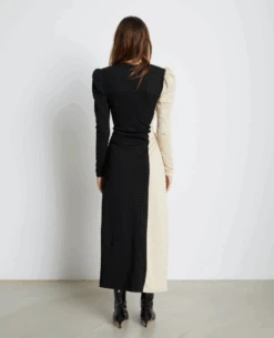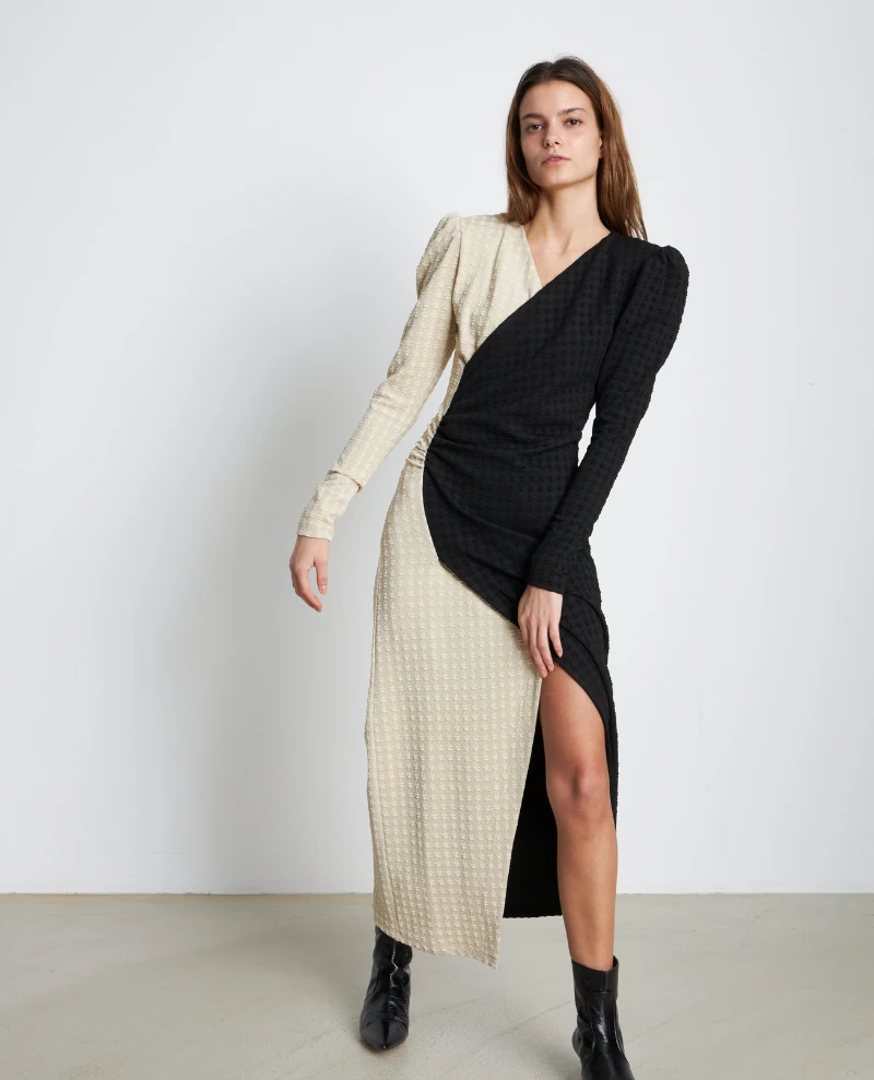 The Stella Nova Odina Cream Black Dress is a stylish and timeless piece for your wardrobe. Featuring a contrast cream and black colour scheme, a v-neckline, long sleeves and a leg slit for ease of movement, this floorlength asymetric dress is perfect for any occasion. With great versatility – style it with boots or heels this Autumn.