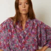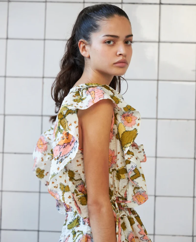 Stella Nova Rauna Light Flowers Blouse, a lightweight floral print blouse. With short frilly sleeves, the Rauna blouse has a deep v-neckline with decorative green and pink print.