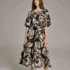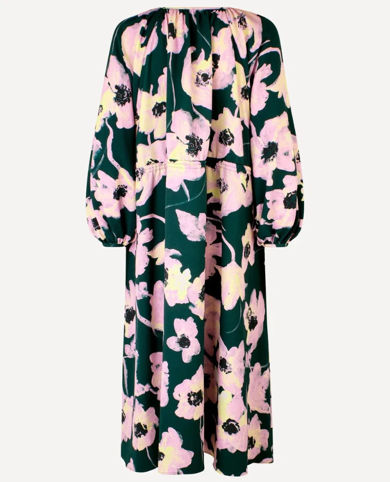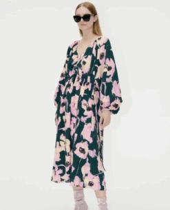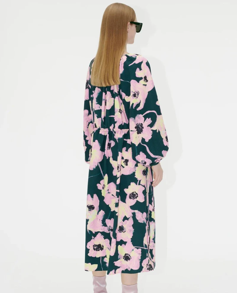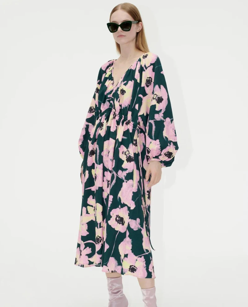 Stine Goya Heather Floral Dress, a relaxed midi dress with cinched waist and puffed sleeves. Complete in pink, black and yellow floral print, the HEather dress has a deep v-neck and is made from a recycled polyester blend.