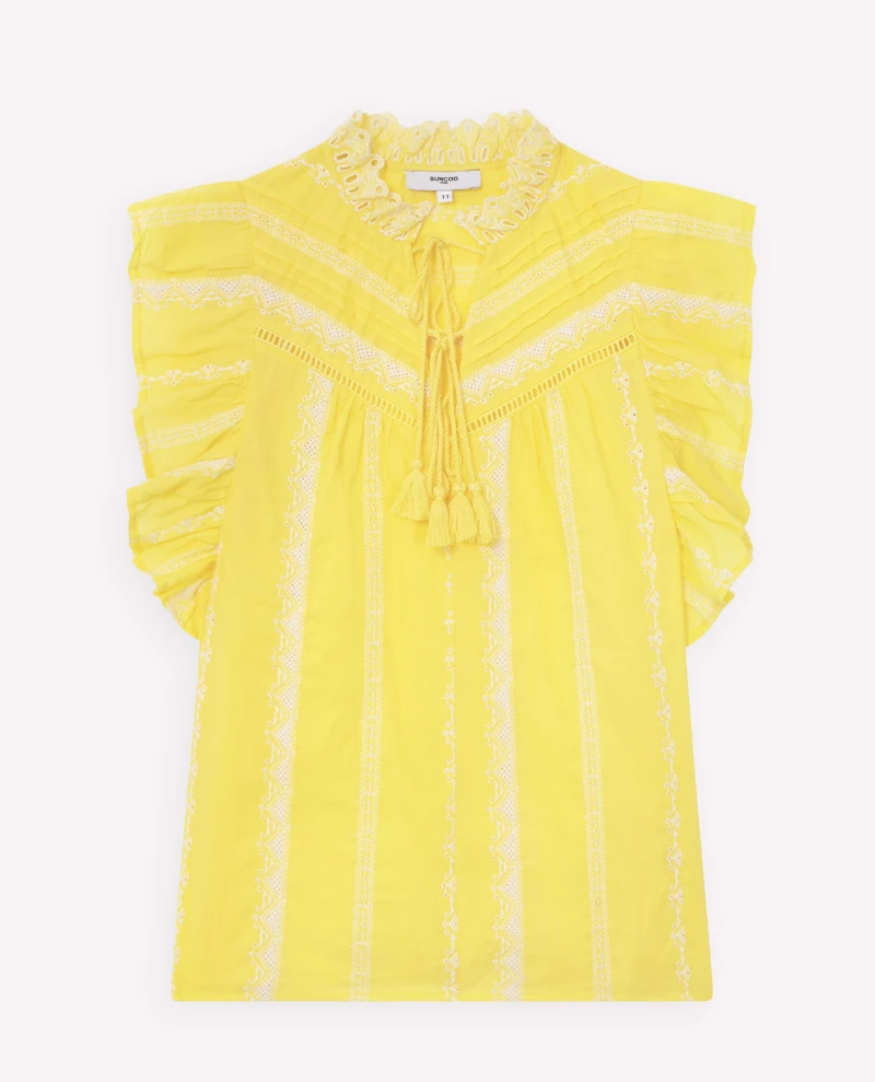 Suncoo Louki Yellow Top, a vibrant and feminine short sleeve blouse. With white embroidery detail and frill to the sleeves and collar, the louki blouse has tassel tie detail to the neckline.