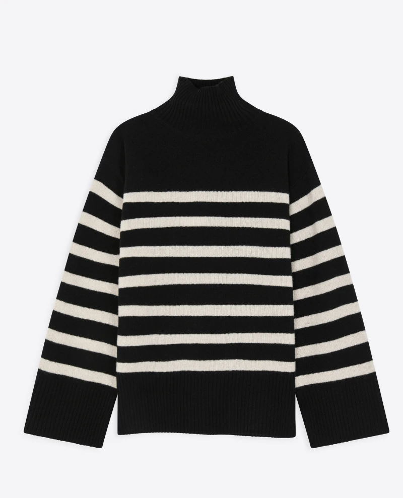 The Suncoo Palacio Black Stripe Knit is a chic, timeless piece ideal for any wardrobe. This long sleeve jumper features a funnel neckline and adorned with white striped detail for added flair. Crafted with care, this jumper is perfect for creating a refined, sophisticated look.
