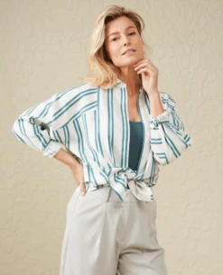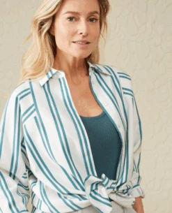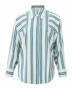 Yaya Blue Blush Grey Stripe Blouse, a classic button down blouse in white and blue. With a relaxed fit, this stripe blouse has asymmetric dual stripe and oxford style collar.