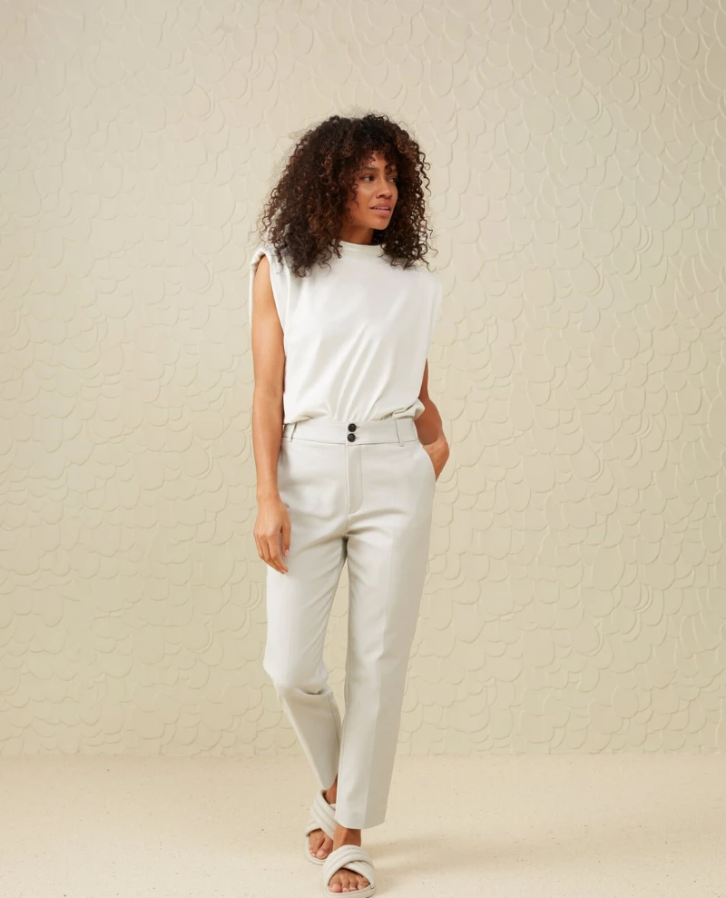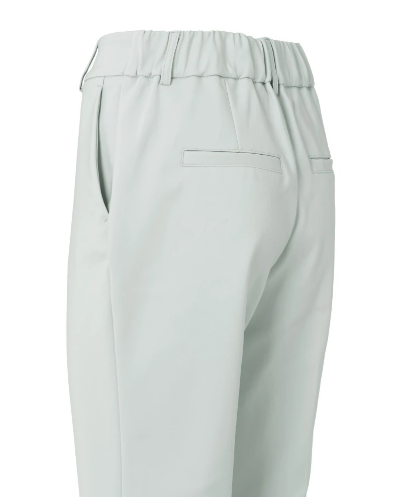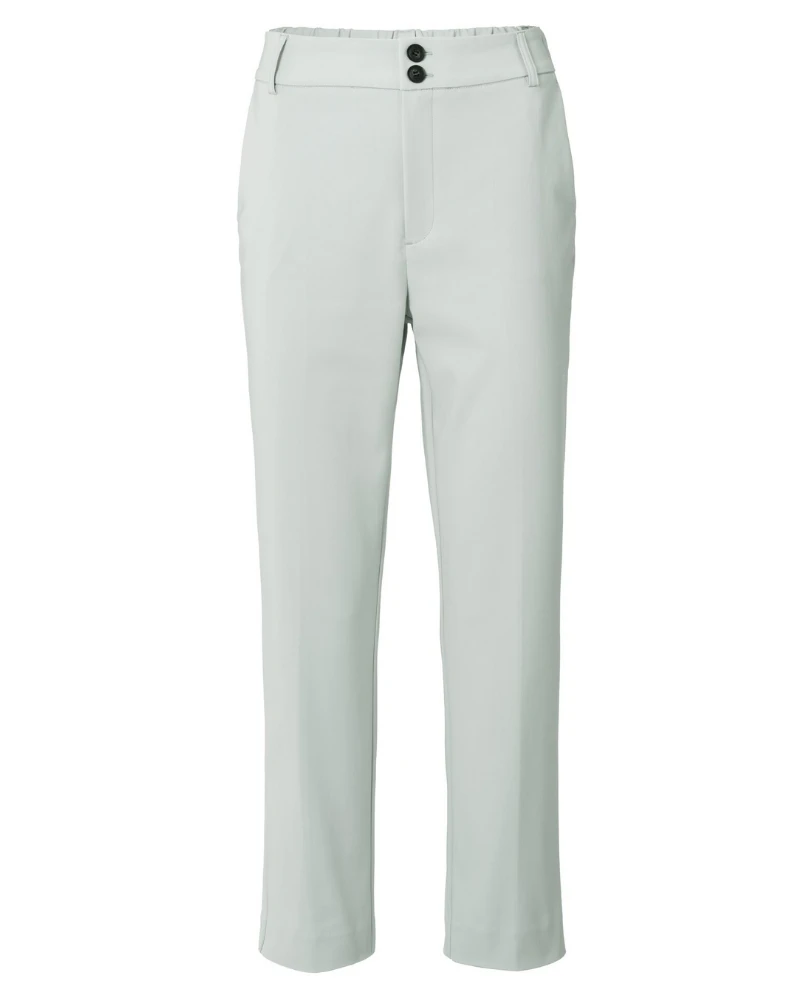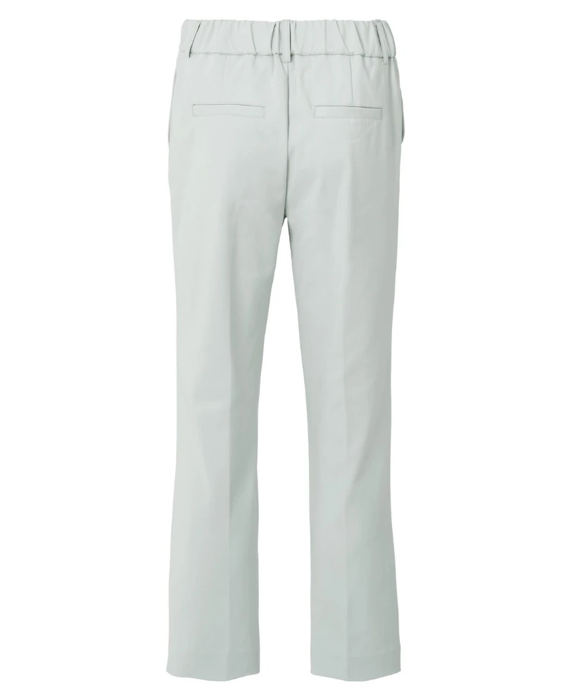 Yaya Droplet Grey Chino Trousers, a pale, flat grey trouser with straight leg. The Droplet Grey Chino’s have a timeless style, with zip and button fastening. Complete with elastic to the waistband and side pockets.